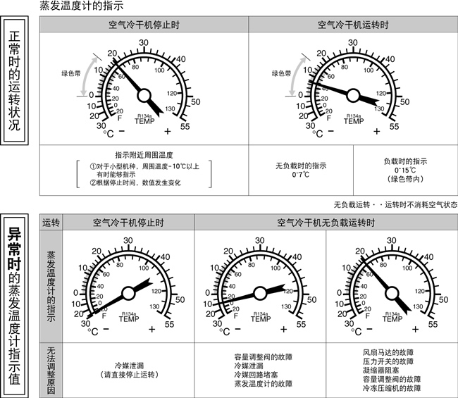 請(qǐng)確認(rèn)冷干燥機(jī)運(yùn)行時(shí)蒸發(fā)溫度計(jì)的指示在綠色范圍內(nèi)。
