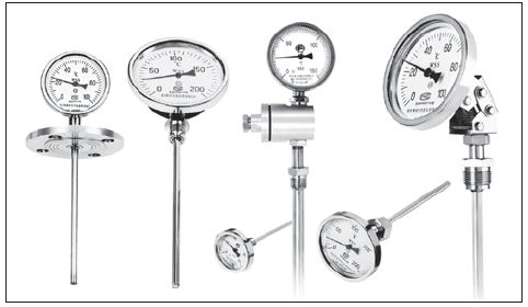 測量氣體和液體的溫度。與玻璃溫度計相比,它具有無汞損壞、讀數(shù)清晰、堅固耐用的優(yōu)點。我生產(chǎn)多用途雙金屬溫度計,規(guī)格品種齊全,質(zhì)量穩(wěn)定可靠,可廣泛應用于工業(yè)、農(nóng)業(yè)、國防和科研領(lǐng)域的各個部門。雙金屬溫度計結(jié)構(gòu)特點和工作原理雙金屬 溫度計(以下簡稱溫度計)使用螺旋加熱器雙金屬板作為溫度傳感元件,并將其安裝在保護套中,一端固定(固定端),另一端(自由端)連接到薄軸上,軸端帶有指針。當溫度變化時,溫度傳感元件的自由端立即旋轉(zhuǎn),并通過細軸驅(qū)動指針以指示刻度盤上的溫度變化。直行溫度計通過轉(zhuǎn)向傳動機構(gòu)驅(qū)動指針。外殼材料包括鋼板、鑄造鋁合金和不銹鋼板。可調(diào)角度溫度計的頭部可借助波紋管、轉(zhuǎn)角機構(gòu)和其他部件從角度調(diào)整為直線或從直線調(diào)整為角度。