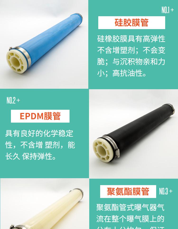 1.曝氣膜管采用三元乙丙橡膠(EPDM)材料,具有耐熱、耐臭氧、耐酸堿、化學穩定性好等特點,與一般橡膠膜相比,可大大提高其使用壽命。
