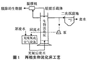 生物流化床技術是一種新型的生物膜法工藝,是繼流化床技術在化工領域廣泛應用后于20世紀70年代初發展起來的。其載體在流化床內呈流化狀態,使固(生物膜)、液(廢水)、氣(空氣)3相之間得到充分接觸,顆粒之間劇烈碰撞,生物膜表面不斷更新,微生物始終處于生長旺盛階段。該技術使生化池各處理段中保持高濃度的生物量,傳質效率極高,從而使廢水的基質降解速度快,水力停留時間短,運轉負荷比一般活性污泥法高5~10倍,耐沖擊負荷能力強。按其生物膜特性等因素可分為好氧生物流化床和厭氧生物流化床兩大類。